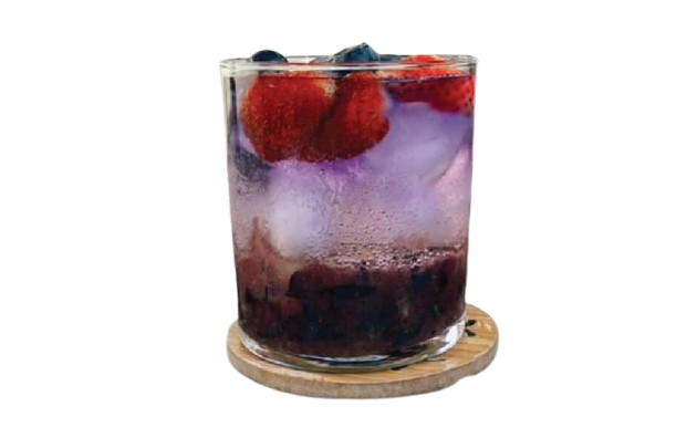 2. Pour the blueberry sauce and Glinter Sparkling Beverage in the container, place fresh strawberry & blueberry into it.